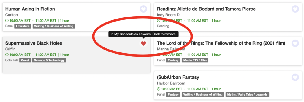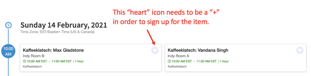 Clicking the heart icon adds regular program items to your personalized schedule.