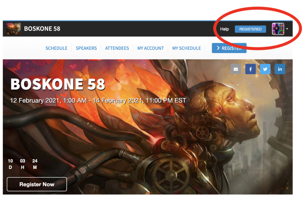 You will return to the landing page for the Boskone 58 event site. It will look the same, except that the login button will either have the preloaded Boskone image or it will  show the image that you saved to your profile the last time you logged into your account.