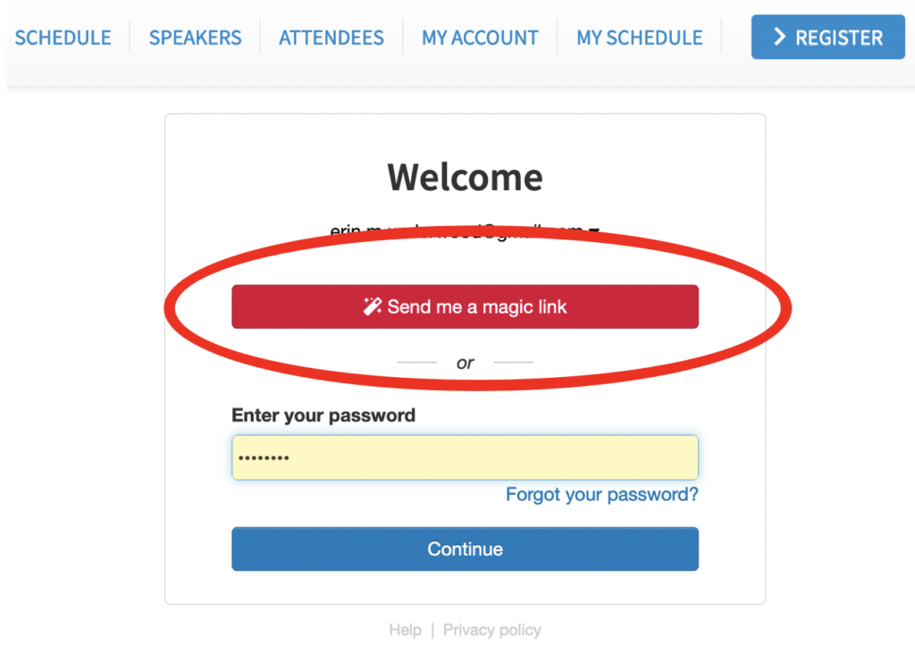 When you login, the system will ask you for your password. You may not know it, and that’s okay. All you need to do is click on the Magic Link button to have the system send you a login link to the email that you used during the registration process.